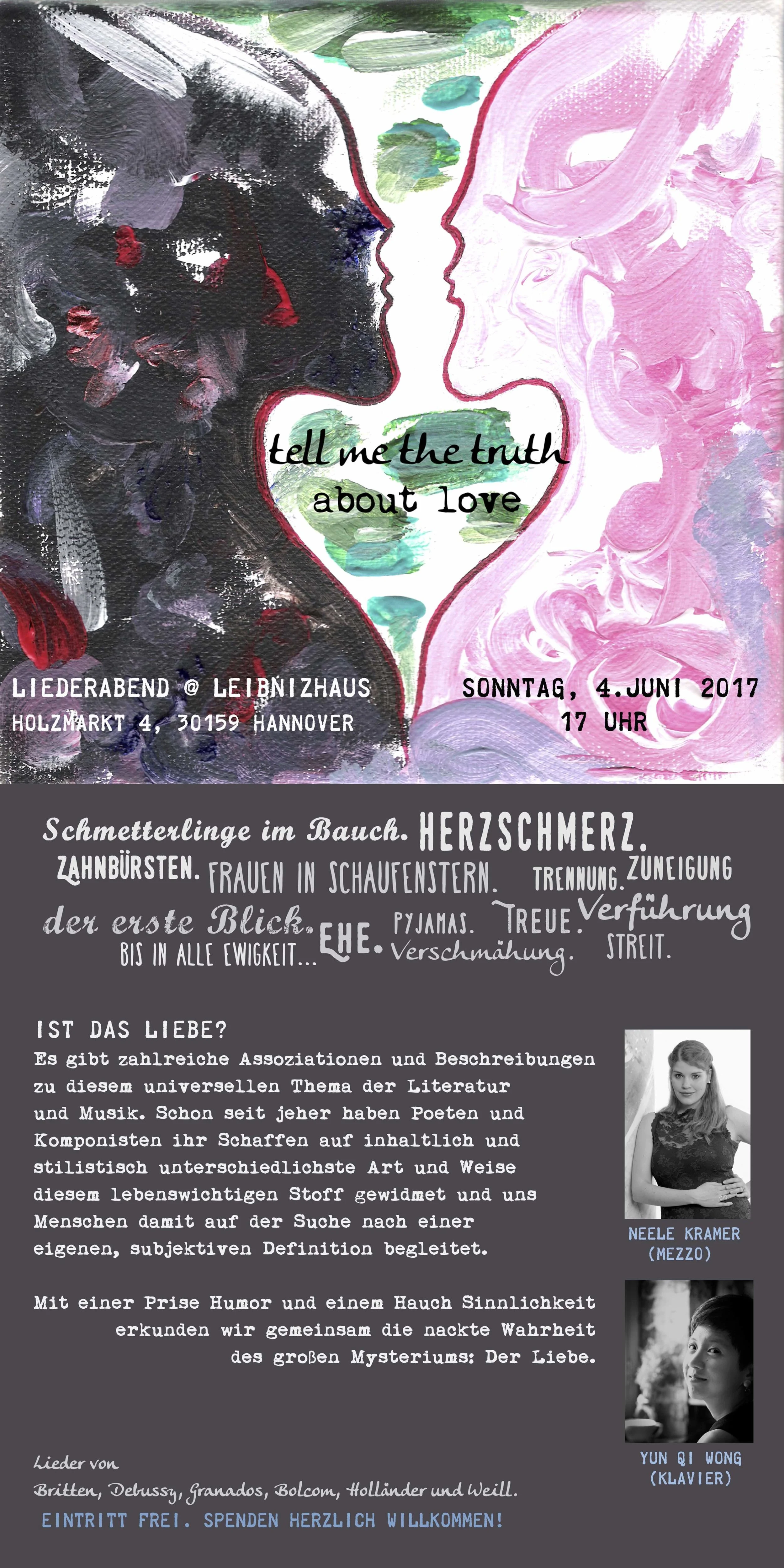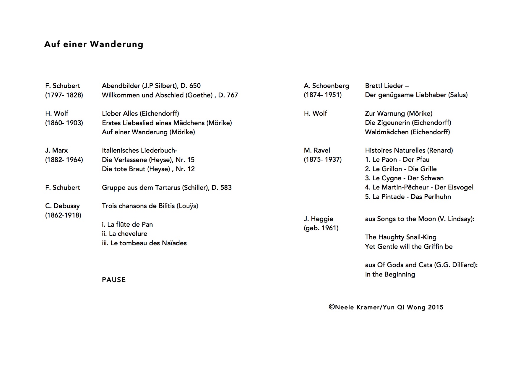 DAS LIEDDUO KRAMER-WONG musiziert seit 2010 zusammen und erhielt wichtige musikalische Impulse bei Prof. Jan Philip Schulze. Darüberhinaus besuchte das Duo Meisterkurse bei u.a. Axel Bauni, Christoph Eschenbach, Matthias Goerne, und Peter Sheppard Skaerved. Das Duo war Stipendiat der Justus-Hermann-Wetzel-Stiftung 2013 und musizierte u.a bei der MarkusMusikWoche, den Max-Reger-Tagen (Weiden an der Oberpfalz), am TfN Hildesheim und beim Siegfried Matthus Symposium in Weimar. Neele und Yun Qi haben gemeinsam Werke von Americ Goh uraufgeführt.